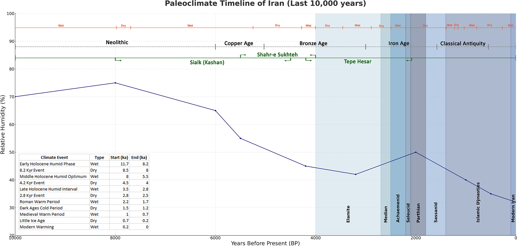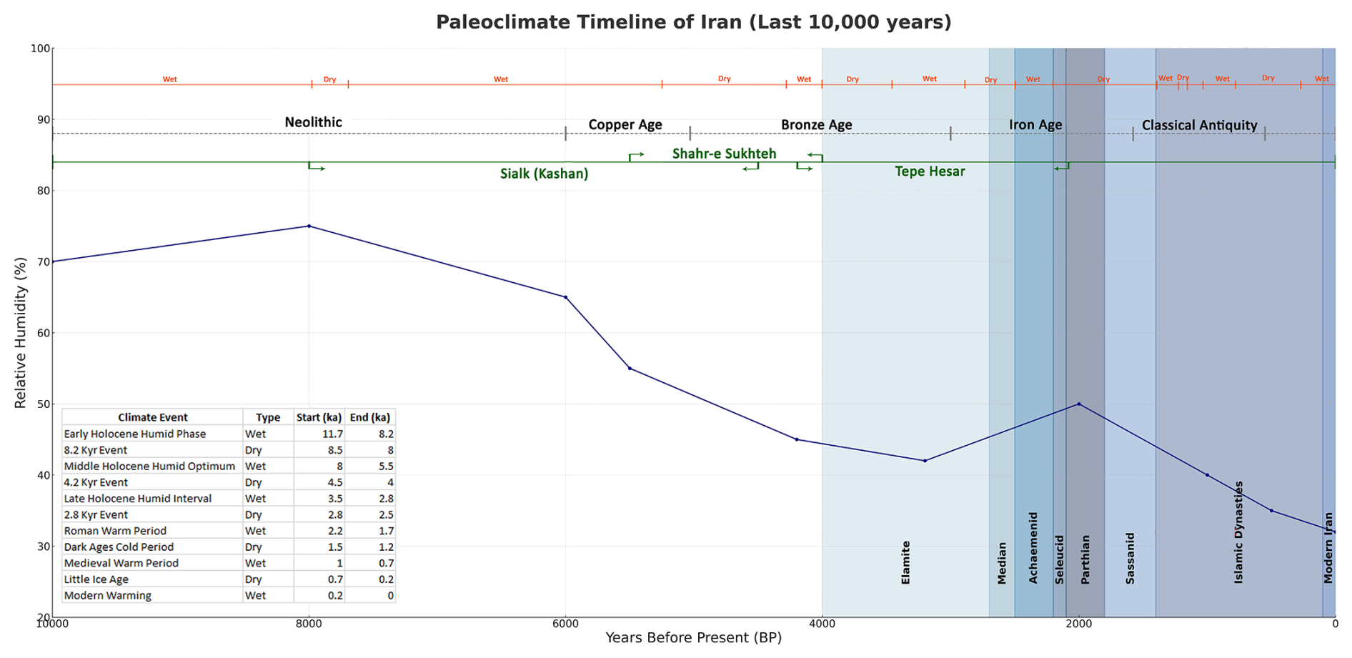 To synchronize historical narrative data with Holocene climate variability, we incorporated high-resolution paleoclimatic proxies, including speleothem-derived humidity indices from the Zagros Mountains, sediment cores from Lakes Hamoun and Seistan, and regional syntheses by Hamzeh et al. (2016) and Kakroodi et al. (2015). A diachronic timeline (see Fig. 1) overlays inferred relative humidity fluctuations with distinct cultural epochs. Environmental dynamics particularly lake-level variability during the mid-Holocene aridification were interpreted through an integrated lens combining metaphorical textual indicators (e.g., “abundant fish” or “the boat path disappeared”) with geospatial and climatological records. Temporal cross-validation ensured alignment between literary motifs and independently established climate transitions.